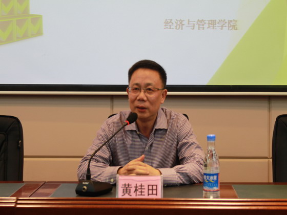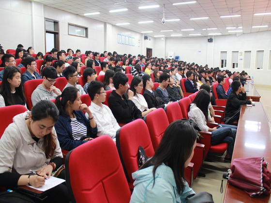 4月19日晚19:30,文科楼A200座无虚席、掌声不断。由招就处主办、经济与管理学院承办的“职业与人生”大讲坛在此隆重举行。这也是经济与管理学院开办“职业与人生”大讲坛的第一讲。北京大学教授、博士、博士生导师、长江学者特聘教授黄桂田应邀作了“选择与被选择”的主题报告。报告会由副校长谈传生主持,经济与管理学院院长陈银娥、党委副书记艾楚君、学院全体辅导员及300多名学生参加报告会。