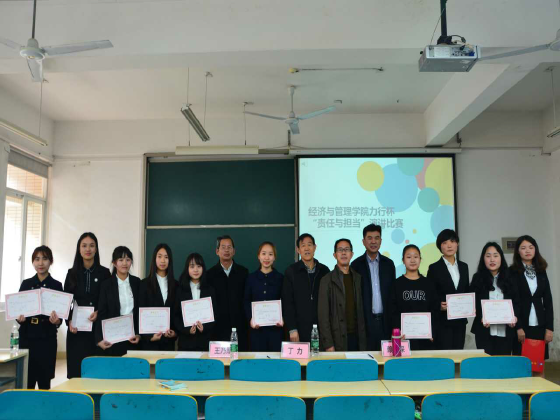 4月11日下午15:00,304永利集团官网入口经济与管理学院“责任与担当”主题演讲比赛决赛在云塘校区文科楼E201举行,本次比赛由学院关心下一代工作委员会和院团委共同举办,校关工委主任王乃厚、招生就业处丁力副处长、马克思主义学院赖某深教授担任评委,院党委副书记艾楚君、院团委书记陈钰汀、辅导员计潇出席本次比赛。
