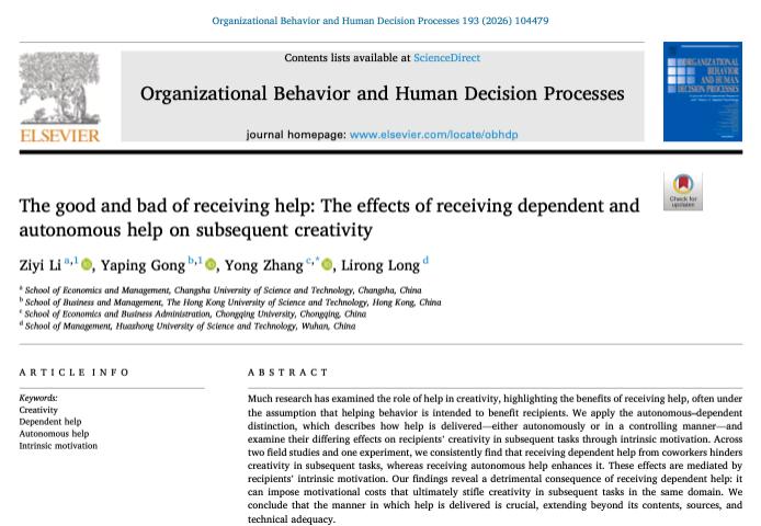 近日,我院青年教师李梓一博士署名第一作者的论文“The good and bad of receiving help: The effects of receiving dependent and autonomous help on subsequent creativity”在国际学术顶刊《Organizational Behavior and Human Decision Processes》线上刊发。