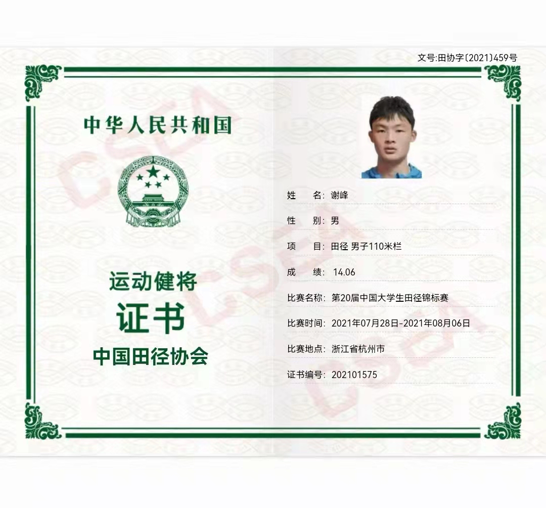 7月31日至8月5日,中国大学生第20届田径锦标赛在浙江大学举行。本次比赛有255所高校参加,共计2778名运动员和教练员同台竞技。304永利集团官网入口学子谢峰喜获男子丙组(高水平组)110米栏决赛全国冠军的好成绩,打破湖南省记录,并以14秒06达到国家健将的标准。