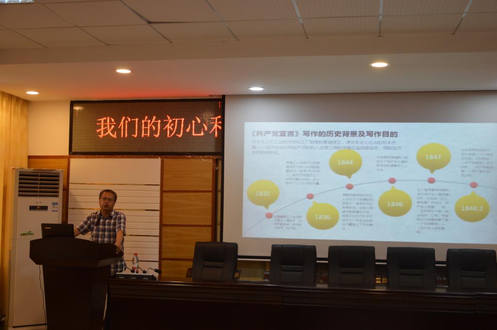 刘教授以“我们的初心与使命,从《共产党宣言》到十九大报告”为主题,怀着崇敬的心情为我们阐述了《共产党宣言》这部有着深刻历史意义的宣言,不仅对当时资本主义社会中的阶级对立和斗争进行了深刻的分析,而且为无产阶级的斗争指明了方向;马克思和恩格斯的这部心血,即使是在二百多年后的今天,对我们分析和理解当今国际政治经济局势以及我国社会主义的发展,仍旧有着深刻的借鉴和指导意义;《共产党宣言》文笔之优美、文章逻辑之严谨,内容概括之强劲,语言叙述之严密,既可以让我们把其当做语文文章训练来阅读,又可以让我们更为理性的思维去分析其真理所在。由此,刘教授层层分析出了“我们的初心与使命”在哪里,倡导所有党员重温《共产党宣言》、认真学习党的十九大精神,深刻领会其政治意义、历史意义、理论意义、实践意义,以新的气象、新的作为创造无愧于新时代的新业绩。