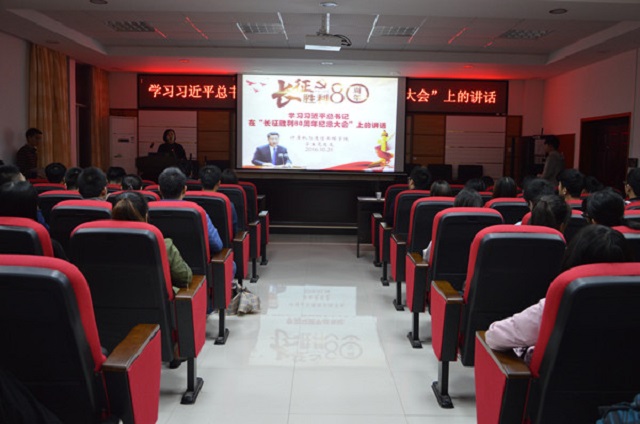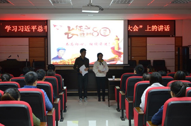 会上,全体党员观看了关于长征的影视资料,回首长征艰苦卓绝的岁月,当一组组触目惊心的数据呈现在学生党员面前,当看到红军战士以血肉之躯,誓死捍卫信仰,不少党员深受触动,甚至动情落泪。接着,王任飞副书记带领全体党员认真学习了习近平总书记在“长征胜利80周年纪念大会”上的讲话,他指出,不忘初心,方得始终,记得来路,才有出路;告诫全党同志务必牢记长征精神,在新的时代背景下,大学生党员务必进一步坚定理想信念,加强纪律意识、大局意识,心中有家国,有人民,不畏艰苦,勇于担当,甘于奉献,竭力完成党赋予的职责与使命,为崇高的信仰矢志奋斗,永远做红军的传人。
