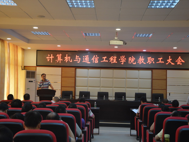 9 8 下午,计算机与通信工程学院在理科楼B311召开全院教职工关于“贯彻落实学校第三届党代会精神”宣讲大会,会议由学院院长李峰主持,副校长黄立宏做重要讲话,计通学院党委书记方琼、党委副书记王任飞、副院长李平、副院长王威、副院长张建明及全院教职工出席会议。