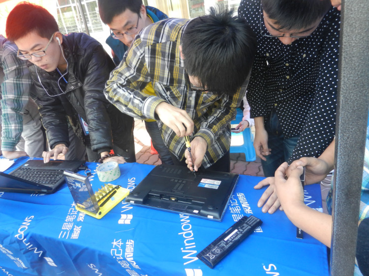 活动现场,陆续有同学带着电脑来到汀香园前,向维修人员求助。热心的维修人员尽自己所能为他们解疑答惑,现场对同学和老师的电脑系统进行升级优化、磁盘分区,细心清理灰尘,并对黑屏蓝屏问题进行解答和维修,受到了同学们的一致好评。