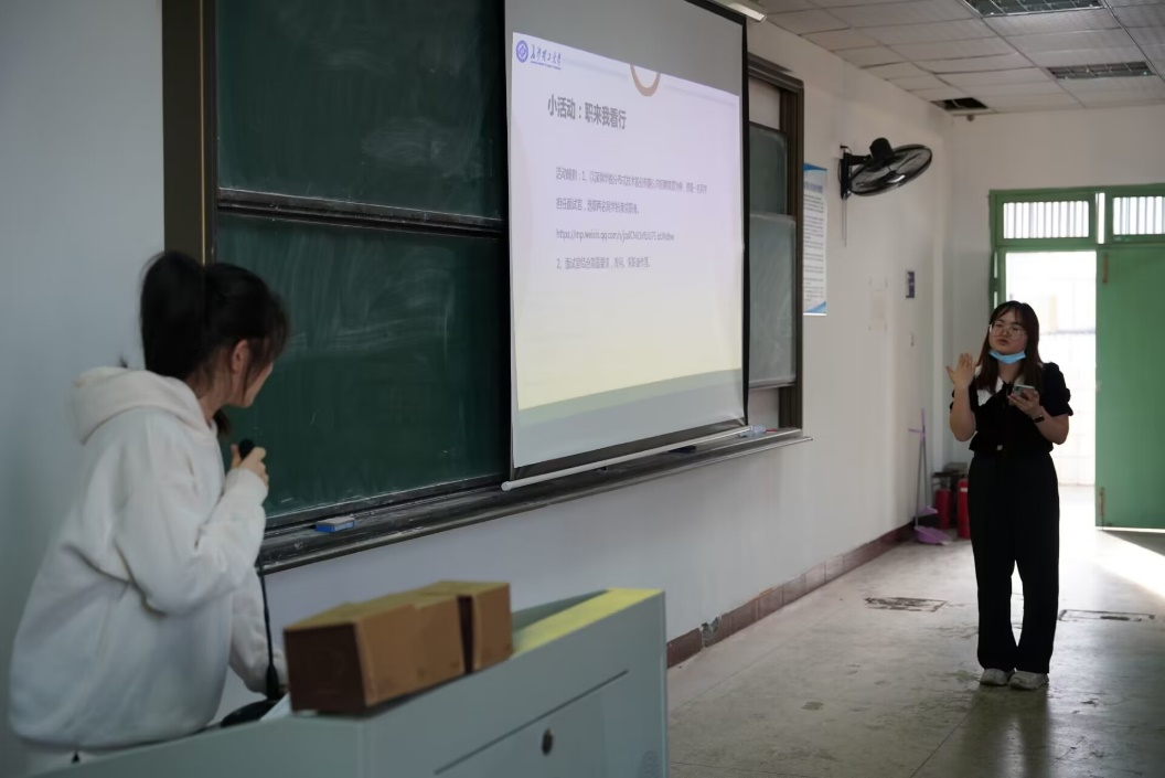 讲座开始,聂静给设计了一个小游戏“如果遇见你”,分别请两位同学饰演2020年的小卷和2024年的大卷,通过对答形式完成一场跨时空的对话。有趣的对话形式让大家发出阵阵笑声,但也同时让引发了大家对未来的担忧。