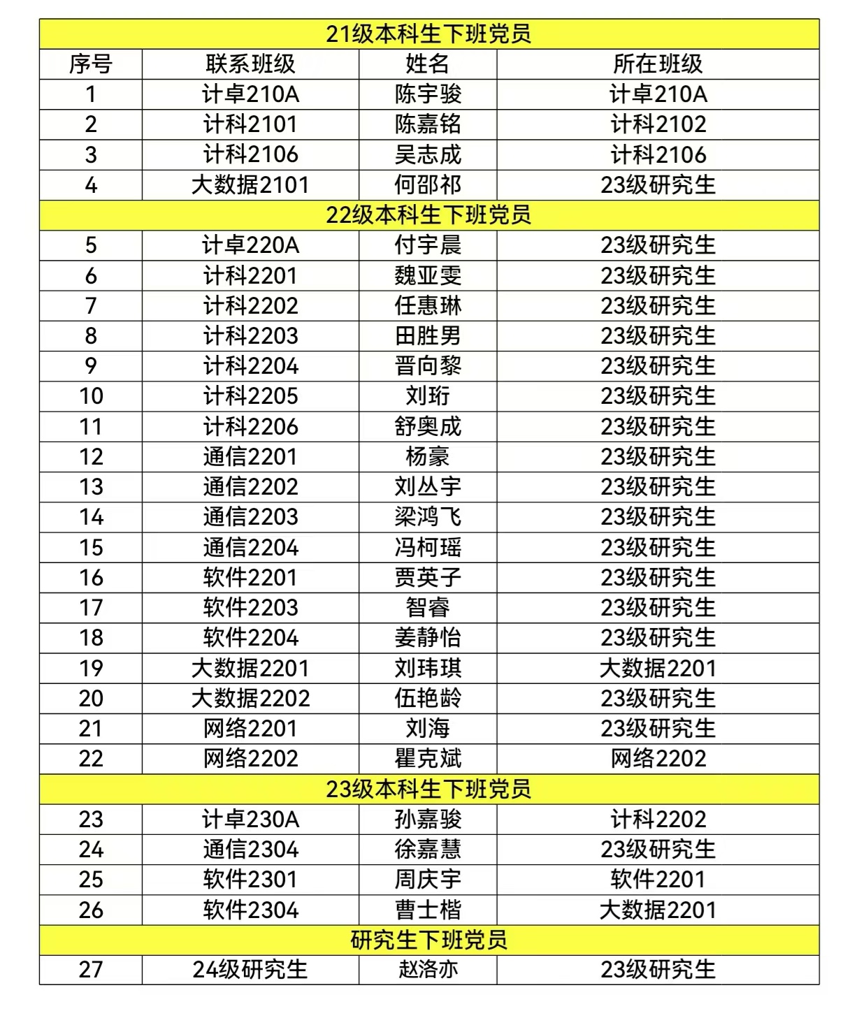 由于部分下班党员已经毕业,为保证后续工作顺利进行,计通学院党总支现对部分班级下班党员进行调整,现将新任下班党员名单公示如下: