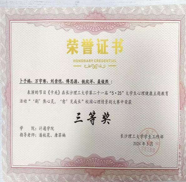 最终,22级卜子嫣,万宇彰,刘崇恺,傅思源,铁欣洋,聂俊熙和21级金天宇同学联合创作的心理情景剧《卡关》作为学院优秀作品推选到学校,并在校级评选中荣获三等奖。