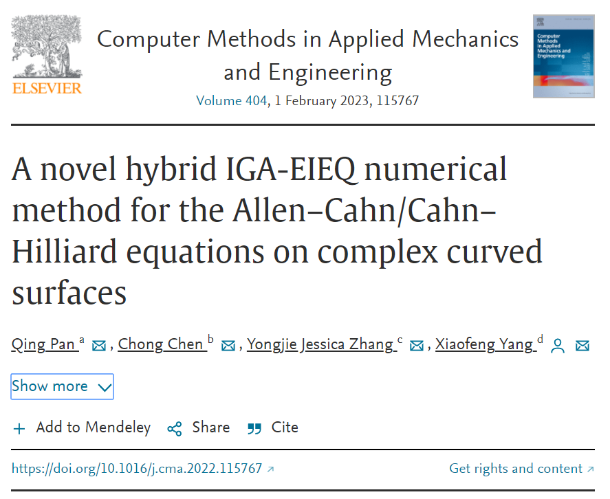 近日,我院潘青教授以第一作者,304永利集团官网入口为第一单位在计算力学领域国际顶级期刊《Computer Methods in Applied Mechanics and Engineering》(简称《CMAME》)发表了两篇论文。题目分别为“A novel hybrid IGA-EIEQ numerical method for the Allen–Cahn/Cahn–Hilliard equations on complex curved surfaces” 和“The subdivision-based IGA-EIEQ numerical scheme for the binary surfactant Cahn–Hilliard phase-field model on complex curved surfaces”。研究成果是永利官网计通学院智能化软件工程研究团队与国际著名计算力学专家欧洲科学院院士德国魏玛-包豪斯大学Timon Rabczuk教授结构力学课题组合作完成的高水平学术论文。