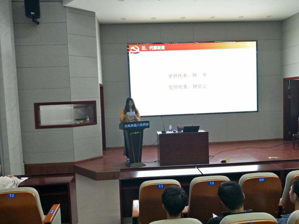 首先全体成员起立奏唱国际歌,并由主持人王光彪介绍党校领导机构。随后积极分子学员代表韩宇提出作为当代大学生的责任和担当,应刻苦努力的学习,积极参加实践活动,做有利于人民大众的实事;党员代表钟文心向学院们致以最诚挚的祝愿,希望他们能在入党的过程中严格要求自己,主动学习党的理论知识与奋斗历程,提高自身的党性修养,积极向党组织靠拢。