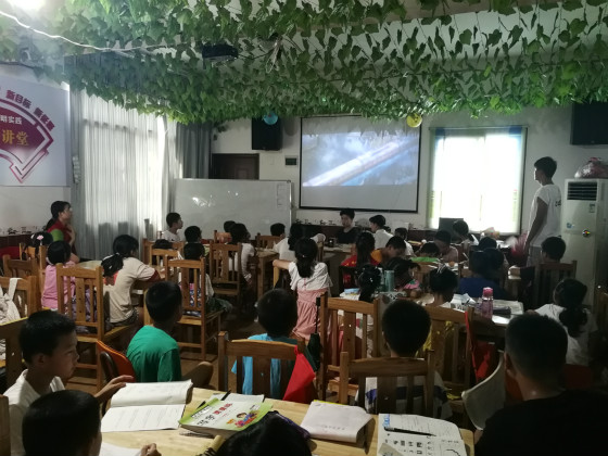 7月23日,交通学院湘水支教团英雄岭分队在“雷锋号”青少年关爱家园开展美学艺术教育。