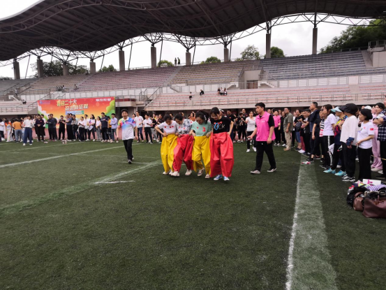 “趣味连体裤”比赛项目,2轮接力,每轮4人。第1组4名队员穿上趣味连体裤从起点线出发到达接力线,脱下连体裤交给本队第2组4名接力队员,接力队员以最快速度穿上连体裤前往起点线。“陆地冰壶”比赛中,每队8人,依次接力。每场比赛两支球队,共分3局,根据三局后总比分进行排名。交通运输工程学院与建筑学院进行激烈角逐,经过三局比拼,交通学院总分略领先。在“携手同行”比赛中,5男5女,两两一组,5轮接力。二人手牵手站于起点线,裁判发令后二人依次完成跨栏、时空隧道,再共同运送气球返回起点,下一组队员以同样方式接力比赛。