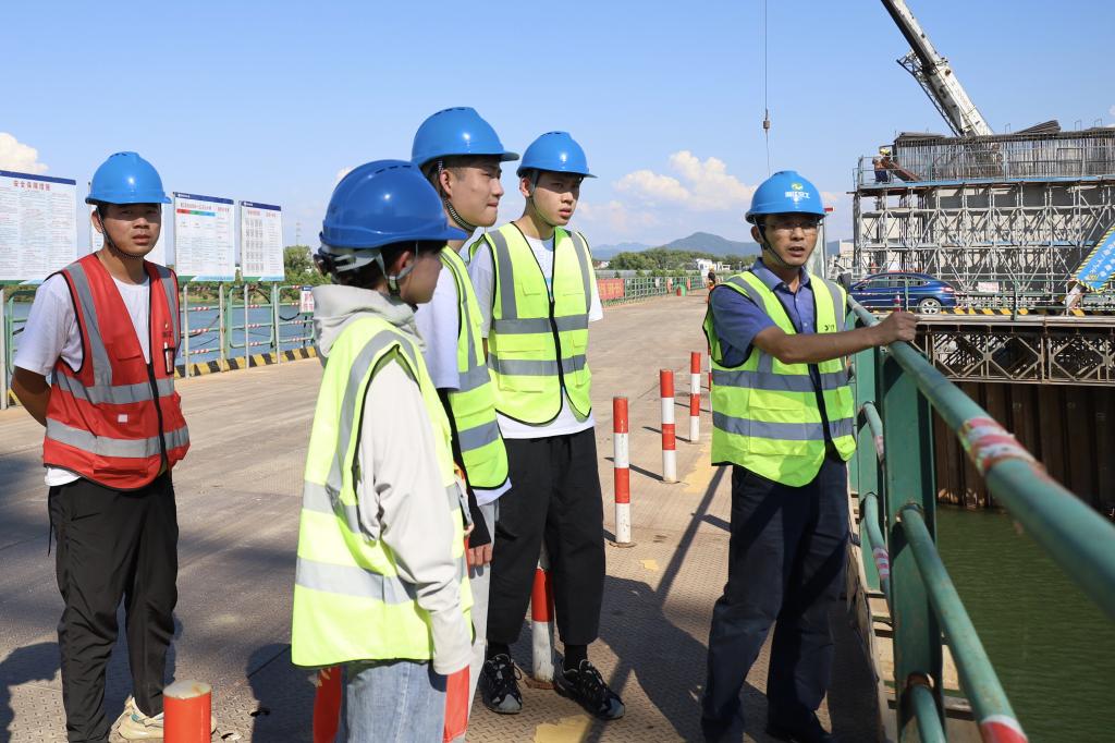 针对实践团成员的学科专业和就业方向,结合自己平时对项目部年轻人的了解,校友阳东陵先生带领团队成员前往了项目新增衢江互通连接线跨衢江大桥施工现场踏勘讲解。