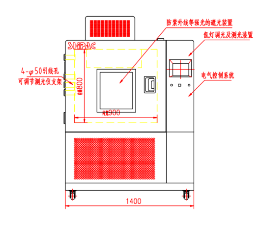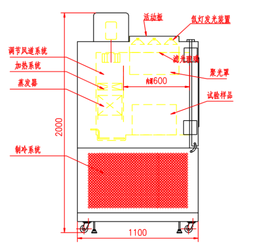 (1)氙灯(1800W~2500W)位于内箱上部,附有滤光玻璃和聚光罩。氙灯装置内尺寸为0.5m×0.9m×0.8m,聚光罩下方的可操作预留高度为0.5m。照射高度60cm-70cm及以上,照射面积350*700mm(在此面积内光照强度均匀),照射面积为中间处,光照强度20-1200W/m2连续可调。选定光照强度后,辐照度的波动不大于5%。光谱范围:0.29-0.8μm。选定辐射强度时的光照波动偏差(测光误差)在50W/m2内。测光精度1W/m2。光感应探头的位置设于距内箱底0.1m处。