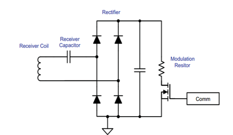 下图2.5为接收芯片的内部部分电路,接收芯片根据负载的情况来控制Comm的电平高低,进而是MOS管导通或断开,这两种状态的阻值差别很大,经接收线圈映射到发射线圈上,来表明状态。