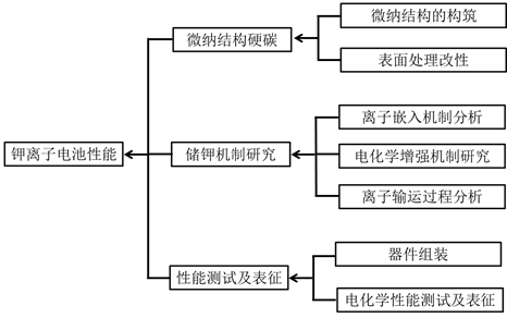 ①研究不同微纳结构硬碳对钾离子电化学性能的影响,进而提升硬碳的比容量,延长电池循环寿命、增加库伦效率。