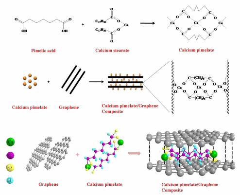 利用庚二酸钙体系与石墨烯表面基团进行反应来合成复合核剂,反应示意图如下: