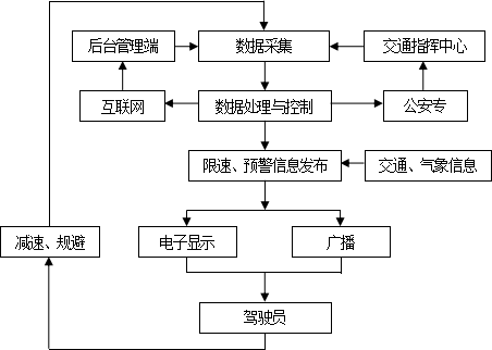 影响隧道口行车安全的因素多样,主要有车流量及车速、路面结冰及积水、光照强度、能见度等。本系统采用无线传感网作为末梢网络,应用磁阻传感器、温湿度传感器、光照传感器等多种传感器,采集各类型数据,实现了隧道口环境信息的全面感知,而不是单一信息。根据全面的环境信息计算出的限速值及预警信息对驾驶员的驾驶行为更有指导意义。