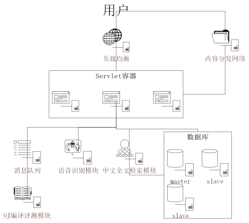 Controller层负责与用户交互收发信息,验证输入数据合法性,按照一定规则将请求分发给Service。Service层拆分处理请求。DAO层负责与数据库交互。我们采用微服务理念,将复杂而逻辑依赖少的模块(例如搜索引擎、语音识别、OJ测评)独立出来,以微服务的形式存在,服务与服务之间采用RPC协议通讯,每个服务专人负责,保证系统稳定性,降低单服务复杂度。