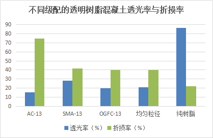 树脂是一种透明的胶凝材料,同时与沥青相比,树脂熔点远高于沥青,用于路面可防止高温天气路面泛油,以及可解决沥青软化带来的车辙等其他路面病害。与此同时,使用树脂作为胶凝材料,可在不改变原有混凝土优良路用性能的情况下,赋予混凝土较好的透光性能。