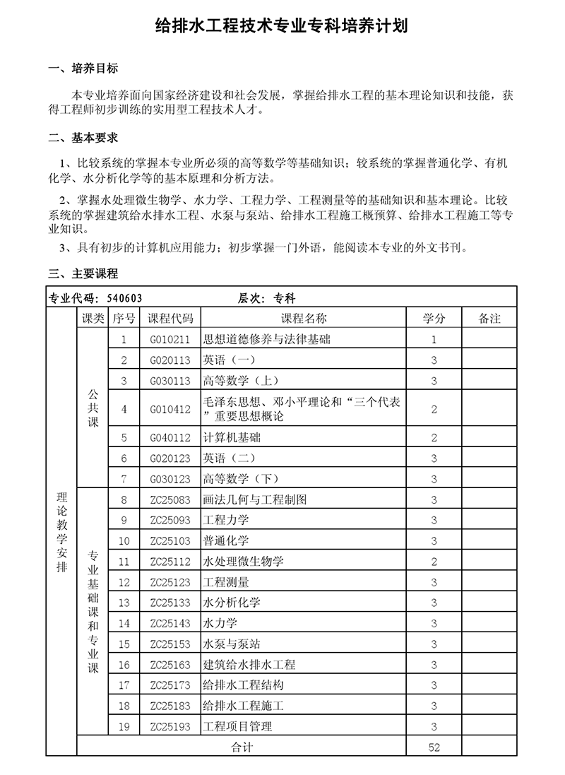 专科培养计划-专业代码:540603给排水工程技术专业