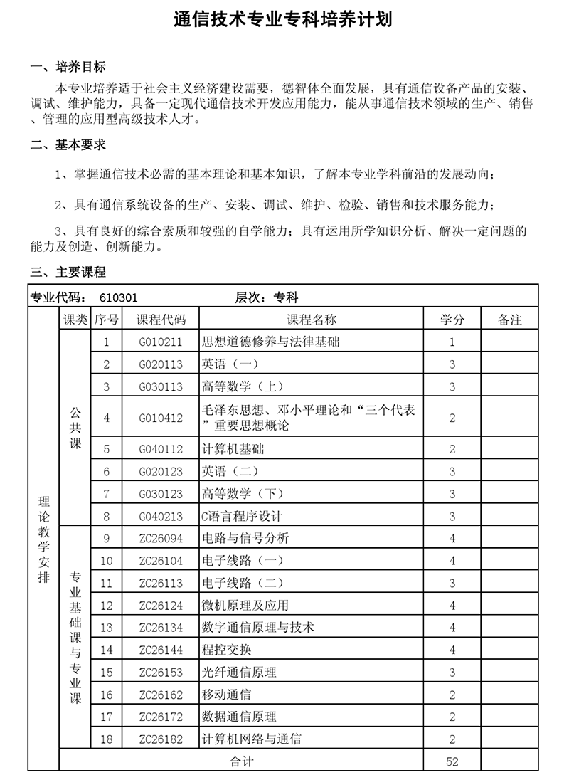 专科培养计划-专业代码:610301 通信技术专业