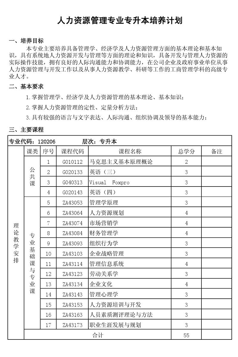 本科培养计划-专业代码:120206 人力资源管理专业