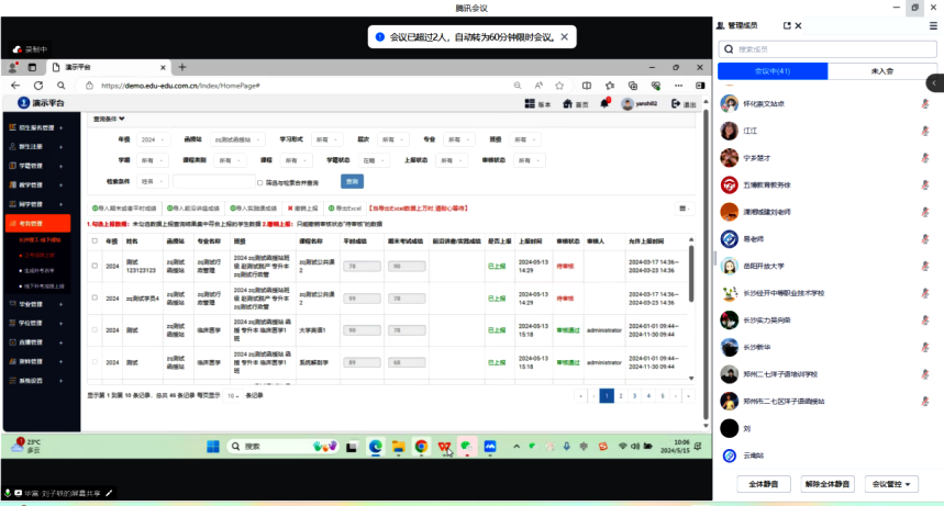 为帮助成教校外教学点熟练掌握学院网络助学平台进行学生成绩的线上申报,2024年5月15日,学院举办了学生成绩线上申报系统的网络培训会。培训会主会场设在15教三楼会议室,由教学管理部副主任李畅主持,教学管理部主任张静、成教部副主任杨昕参加;分会场设平台开发公司会议室,由相关技术人员进行培训讲解;另有44个成教校外教学点的相关工作人员线上参会。