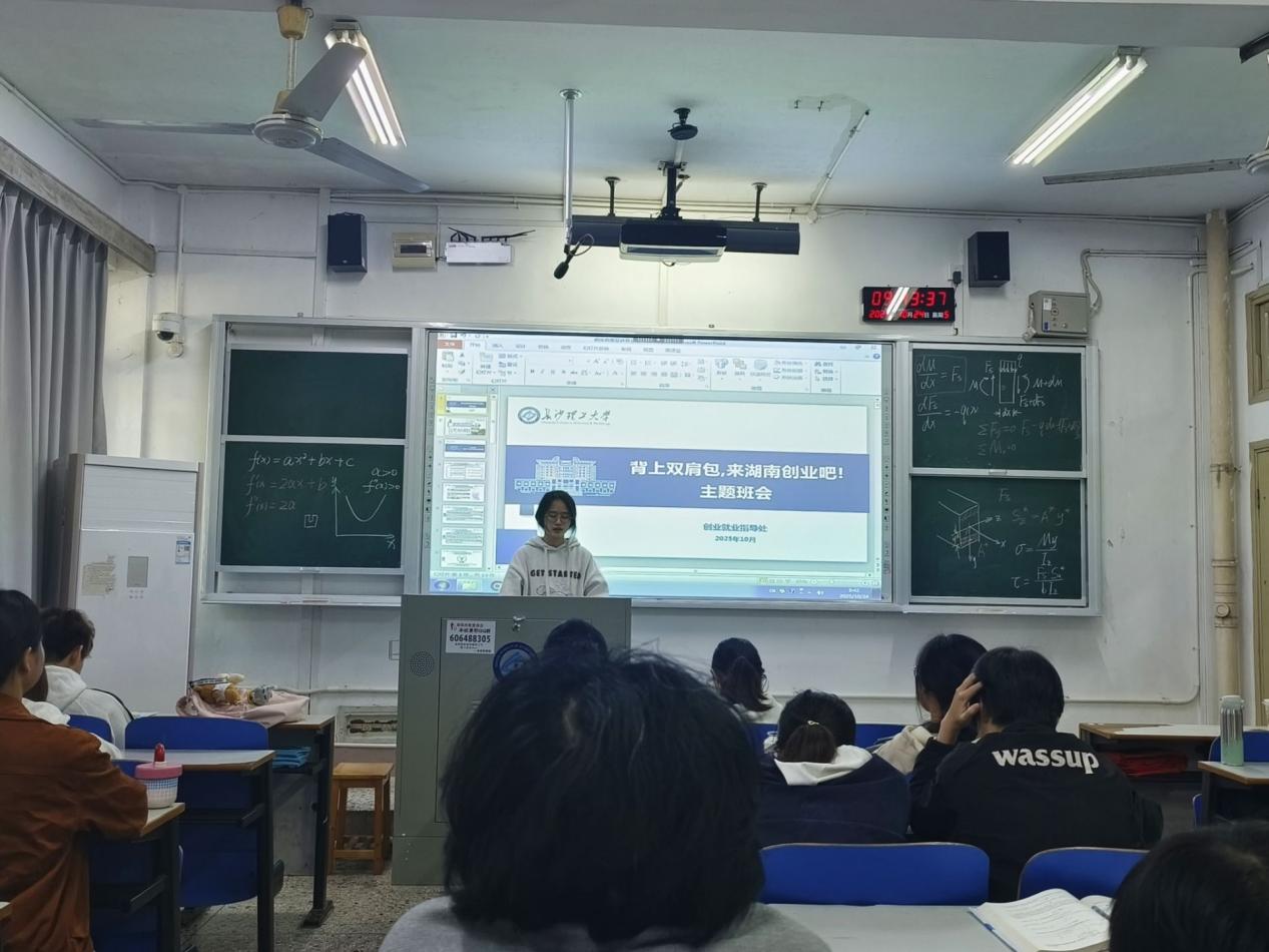 班会中,各班级围绕四大核心内容展开系统学习。首先,通过PPT演示、案例分析等形式,详细解读《湖南省大力支持大学生创业若干政策措施》中的“七个一”举措,包括搭建创业服务平台、落实创业扶持资金、组建导师队伍等关键内容,让同学们清晰了解省级层面的全方位支持。随后,重点学习湖南省教育厅“两直接”政策与304永利集团官网入口“三优先”“两配套”“六可以”举措,针对休学创业保留学籍、弹性学制申请、校内场地免费使用等与学生密切相关的条款,逐一明确申请条件与办理流程,现场解答同学们的疑问。