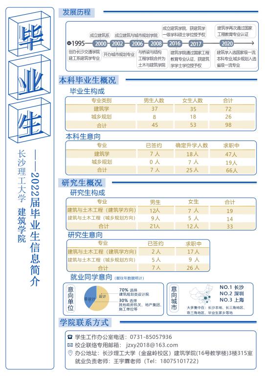 目前建筑学院 2022届毕业本科生共有 98 人,其中建筑学专业 72 人,城乡规划专业 26 人。毕业研究生共有 33人,其中建筑学方向19 人,城乡规划方向 14 人(毕业生信息详见《附件一》)。为使我院毕业生与用人单位达成良好的沟通,配合贵单位做好 2022届毕业生接收工作,我院兹定于 2022 年 3月 15日——4月 25日举办304永利集团官网入口建筑学院 2022年春季招聘会。诚挚邀请贵单位光临指导!