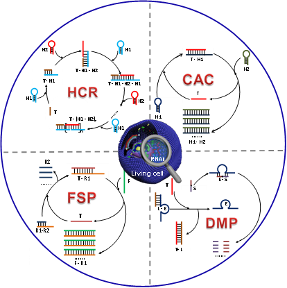 核糖核酸(ribonucleic acid,RNA)是细胞内重要生物分子,通过基因编码、解码、调控和表达等方式参与重要生命过程。研究表明,特定RNA分子表达水平的失衡与重大疾病发生、发展相关,已成为癌症等重大疾病诊断的分子标记物。RNA分子表达水平很低,需要依赖信号放大技术才能获得其含量信息。传统的聚合酶链式反应(polymerase chain reaction,PCR)对核酸分子具有很强的信号放大能力,但是依赖热循环处理过程,只能实现体外或细胞裂解液中核酸分子的放大分析,无法实现细胞内RNA标记物的原位放大成像。等温荧光原位杂交技术(fluorescence in situ hybridization, FISH)通过将酶和探针导入细胞内,可实现细胞内RNA分子的原位放大成像,但是该技术需要对细胞进行固定等操作,无法实现活细胞状态下的成像分析。细胞内生化物质的表达水平和存在状态与细胞生命状态紧密相关,因此,为了获得更加原位、准确的生理病理信息,发展有效的技术手段,实现活细胞状态下RNA分子的放大成像分析十分必要。