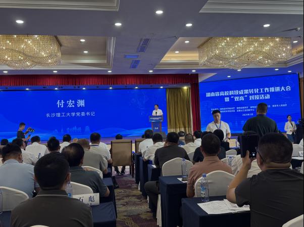 7月24日,2025年湖南省高校科技成果转化工作推进大会暨“双高”对接活动在湘潭市召开,本次会议由湖南省科学技术厅、湖南省教育厅、湖南省卫生健康委员会、湘潭市人民政府主办,高校、县市区(园区)、企业共400余名代表参会。会议由湘潭市市委副书记、市人民政府市长李永亮主持,湘潭市市委书记、省韶山管理局党委书记(兼)胡贺波,省科技厅厅长朱皖,省人民政府副省长曹志强参会指导并作讲话。