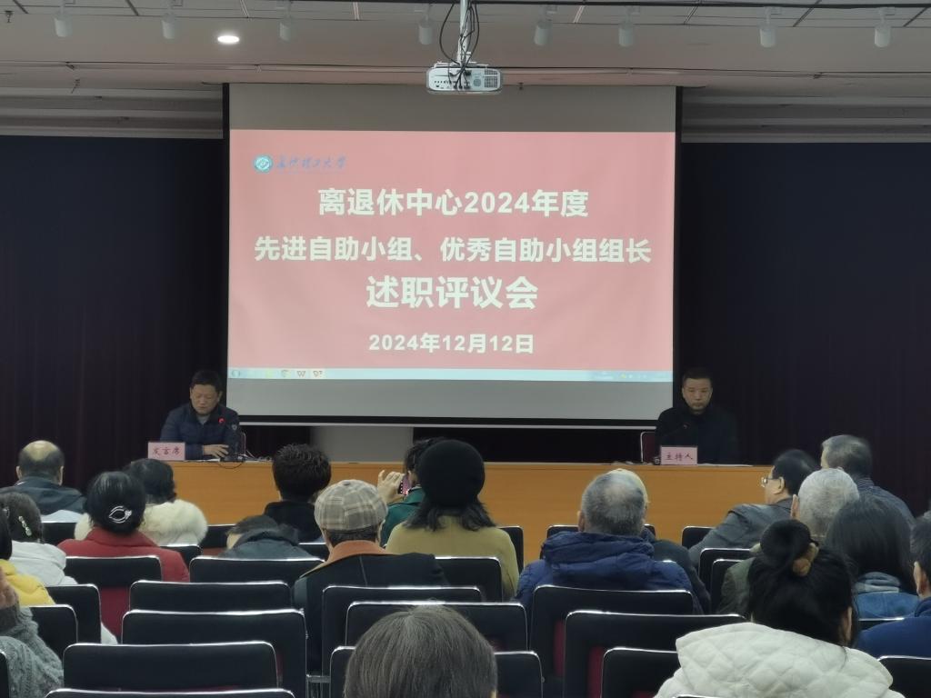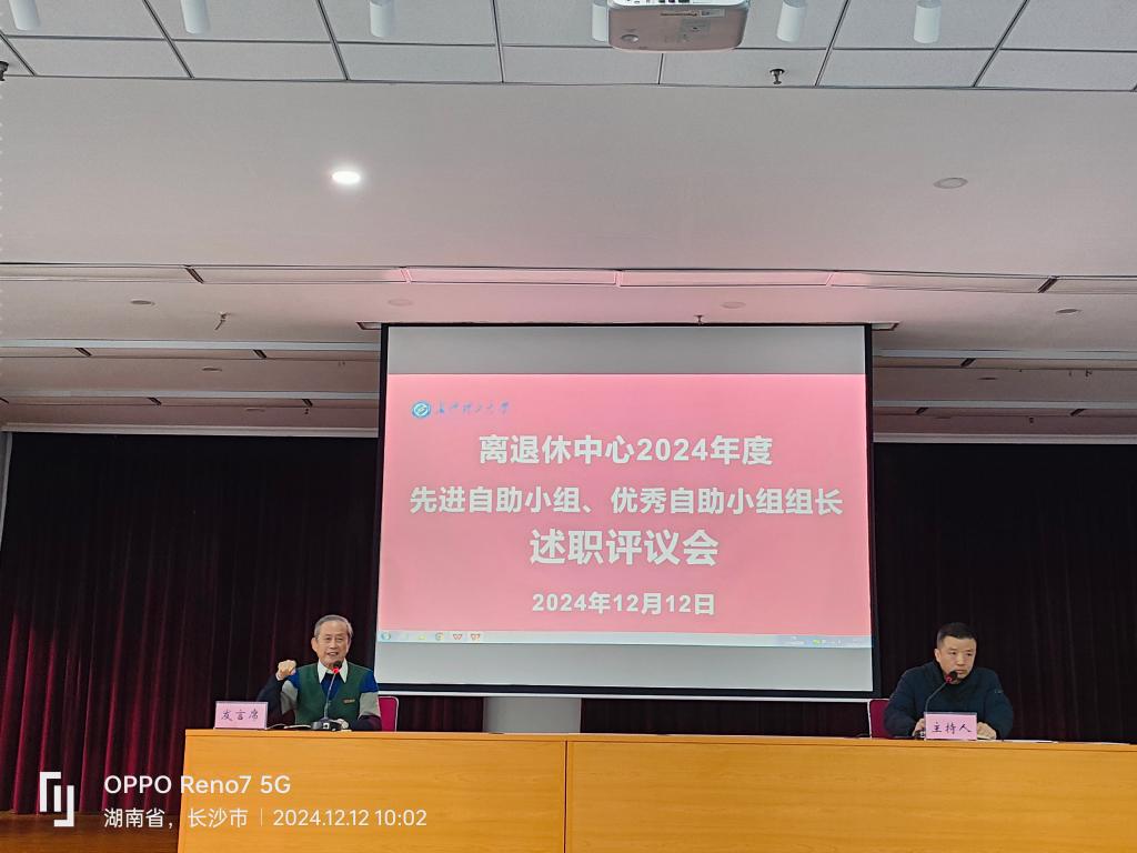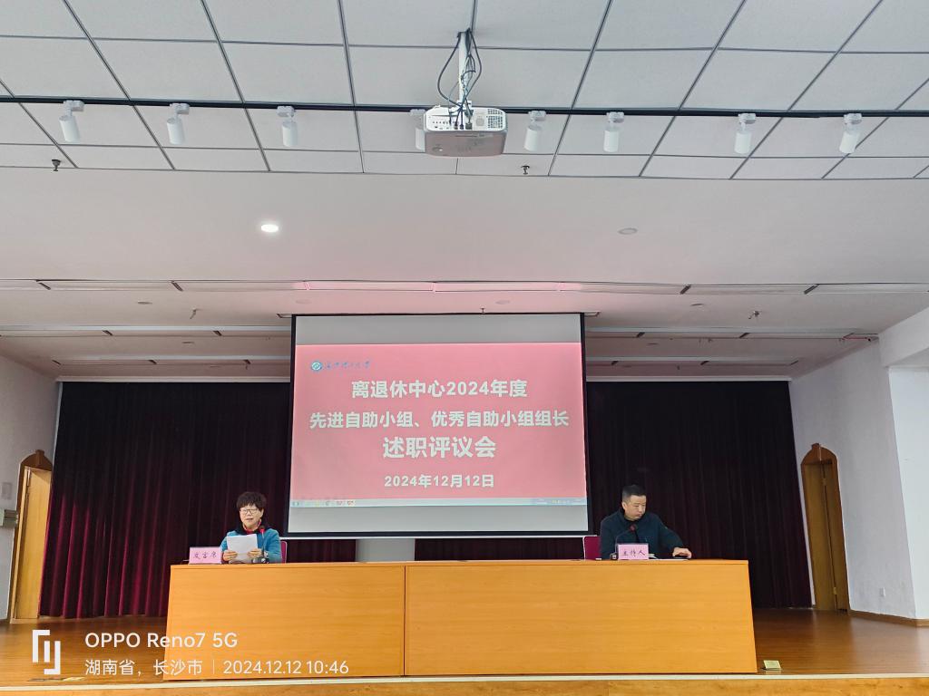 12月12日,离退休中心金盆岭校区五教 5 楼多功能厅举行了 2024 年度自助服务小组述职评议会,此次会议旨在评选先进自助服务小组以及优秀自助服务小组组长(副组长)39 个自助服务小组的组长与中心全体工作人员参加。会议由中心副主任周宇佳主持。