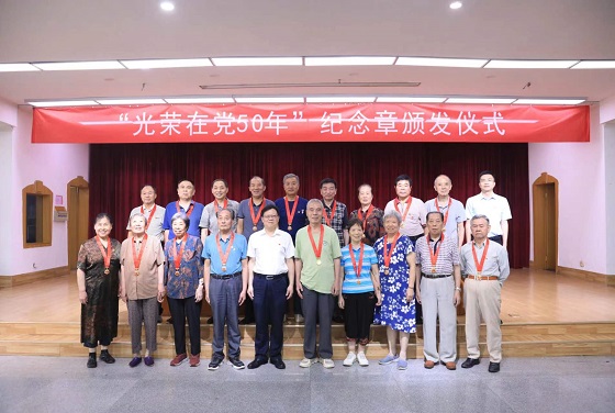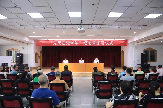 7月5日下午,永利官网在金盆岭校区五教多功能厅举行“光荣在党50年”纪念章颁发仪式,学校党委副书记刘建民、组织部常务副部长陈曦出席仪式,为24名党龄达到50年的老党员颁发纪念章。仪式由离退休教职工党委书记徐亮主持,部分老同志代表和离退休中心科职以上干部参加。