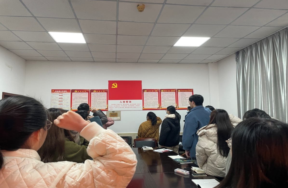 大会以雄壮的义勇军进行曲开始,本次大会严格按照预备党员转正流程进行,首先由童瑶、杨珺、胡澜三名预备党员就自己一年预备期的表现情况做出汇报,他们言辞恳切地向党组织汇报了预备期一年内的思想情况、学习情况、生活情况等,并向党组织表决心,表示在今后的工作与学习中将努力提高为人民服务的本领,积极帮助身边的人们,践行社会主义核心价值观,认真学习,努力做到最好,以更加严格的标准要求自己,不断向做一名合格的共产党员的目标靠拢,发挥共产党员的先锋模范作用,做到全心全意为人民服务。随后,由三名预备党员各自的介绍人委托支部党员介绍对预备党员教育和考察的情况并表态。经支委会研究决定,全体正式党员进行讨论,以无记名投票的票决方式进行表决,童瑶、杨珺、胡澜三位同志获得的同意票数超过应到会有表决权党员的半数,支部大会通过其转为正式党员。决议结束后,支部书记阮曼作为领誓人,带领所有党员一起高举右手,庄严宣誓:“我志愿加入中国共产党……随时准备为党和人民牺牲一切,永不叛党。”铿锵恢宏的誓词,强烈震撼着在场的每一位党员,一字一句,神圣而豪迈,体现了支部党员对中国共产党的无限忠诚。