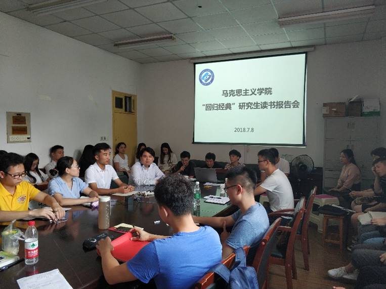 7月8日下午3点,304永利集团官网入口马克思主义学院“回归经典”研究生读书报告会在金盆岭校区4教503隆重举行。马克思主义学院党委书记易显飞教授莅临现场指导,学院每个二级学科代表结合各自专业对阅读的经典进行汇报,17级全体研究生参加了此次活动。