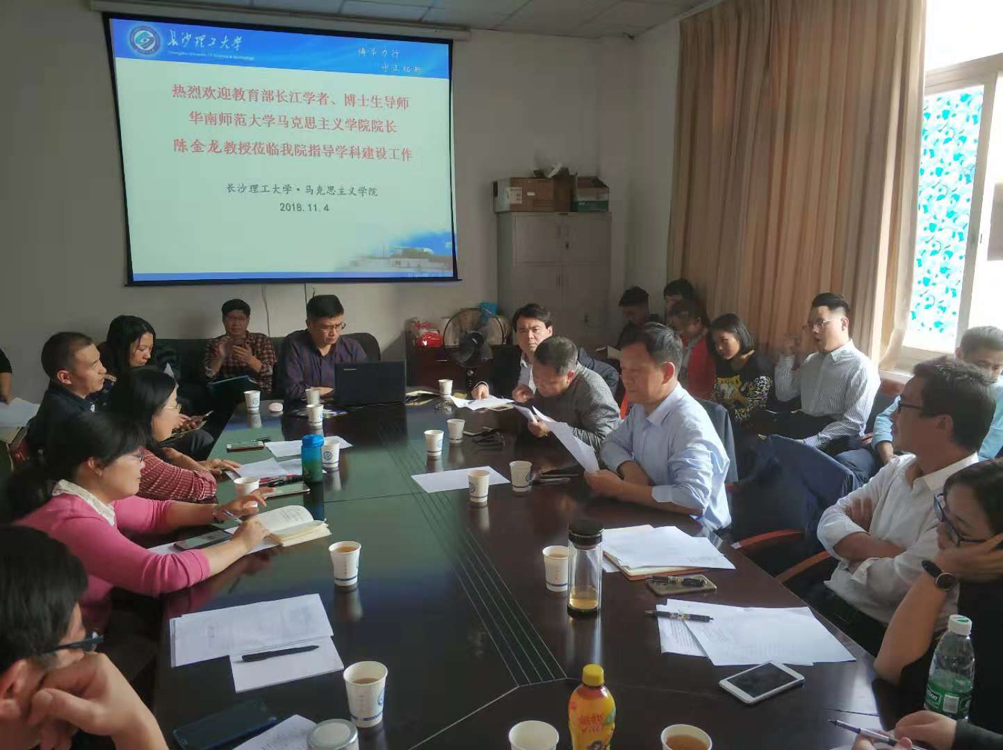2018年11月4日下午,教育部长江学者特聘教授、中央马工程首席专家、华南师范大学马克思主义学院院长、博士生导师陈金龙教授莅临304永利集团官网入口马克思主义学院,在金盆岭校区4-503会议室指导了我院科研与学科建设工作。学校人文社科处卿定文处长、马克思主义学院陈万球院长、院党委易显飞书记、张明海副院长、教授委员会主任余乃忠教授以及学院教师30多人参加了本次指导会。本次指导会由陈万球院长主持。