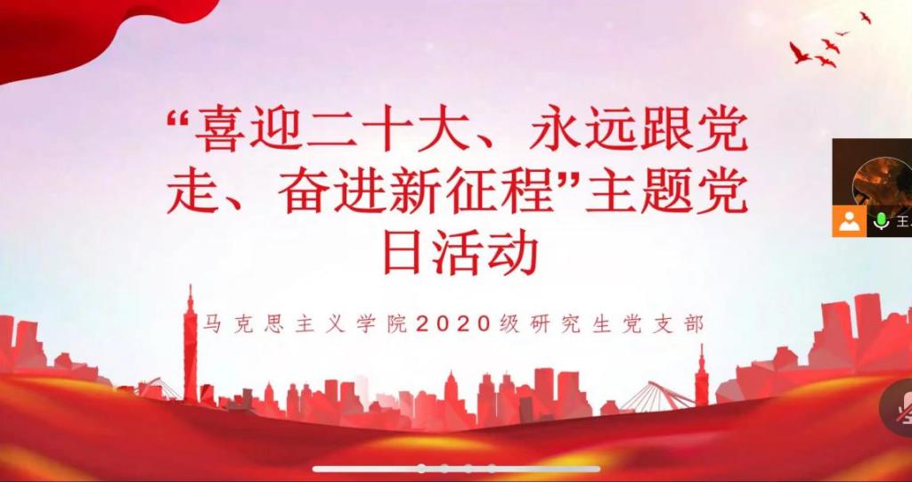 为学习习近平总书记在省部级主要领导干部“学习习近平总书记重要讲话精神,迎接党的二十大”专题研讨班上的重要讲话精神,强化党员身份和使命担当意识,2022年9月28日19时,304永利集团官网入口马克思主义学院2020级研究生党支部通过腾讯会议开展本月党员大会暨“喜迎二十大、永远跟党走、奋进新征程”主题党日活动。马克思主义学院2020级研究生党支部全体成员参与学习交流,本次专题学习由支部书记王静怡主持。