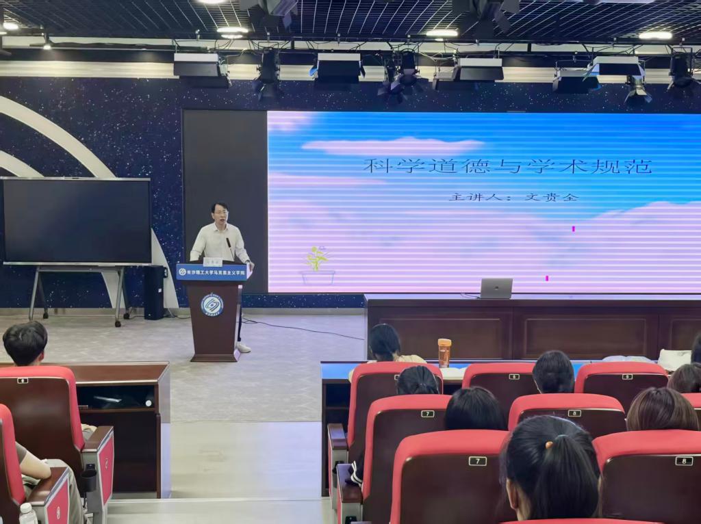 2025年9月17日上午9:00,马克思主义学院在云塘校区文科楼B300报告厅开展“科学道德与学术规范”专题讲座。此次讲座旨在引导新生在未来的科研和学术活动中牢固树立科学道德意识,切实加强学术规范。讲座由学生工作办公室主任、辅导员曾蓓主持,副院长文贵全担任主讲,2025级全体研究生参加。