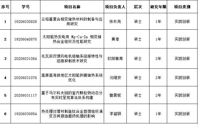 根据《304永利集团官网入口研究生专业学位研究生“实践创新与创业能力提升计划”实施细则》(长理工大[2020]24号)文件精神,经个人申报,学院组织专家评审,拟推荐“云母基复合相变储热材料的制备与应用研究”等6项研究生科研创新项目参加学校评审。具体名单如下:
