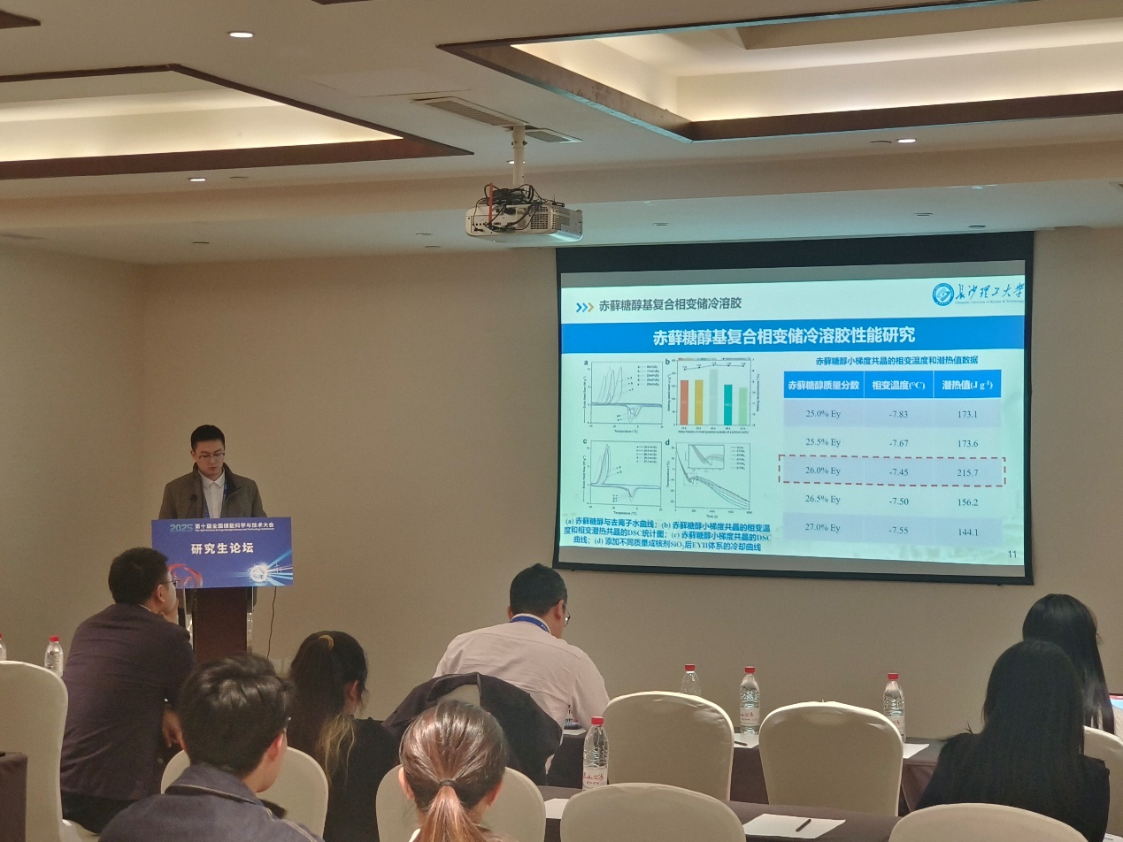 闫歆睿在本届大会的第一届研究生论坛做题为“赤藓糖醇基复合相变储冷溶胶的制备与性能研究”的学术报告,与储能领域相关学者开展广泛的学术交流,并深入了解储能领域的研究进展,拓宽了学术视野。经专家委员会评选,闫歆睿获研究生论坛最佳报告奖。