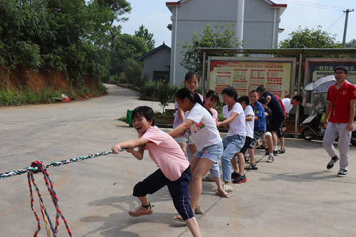 “所有同学到操场集合!”孩子们都兴高采烈的跑出教室,在体育老师的带领下站好队列。行健班和弘毅班的孩子在体育老师的组织下进行拔河比赛。两边纷纷紧握绳子,进入紧张的准备状态。“预备—开始!”体育老师一声令下,两边同学都身体往后倾斜,一齐发力,绳子绷紧,红带在中线左右移动,胜负难分。