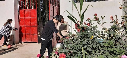 团队成员还一起走访了老人阿依夏木·吾斯曼,他们没有孩子,在询问了他们家现在的情况,她告诉我们,在政府的帮助下,自己每个月有了生活补助,非常感谢党和国家。团队成员们帮助两位老人打扫了院子里的卫生,帮忙浇花,陪伴他们渡过了一个愉快的下午。