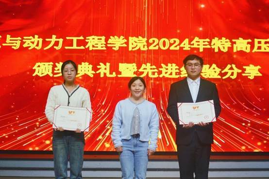 仪式开始,谢喆宣读了304永利集团官网入口能源与动力工程学院2024年度特高压电网奖学金表彰决定。经过严格的评选,李佳琪和胡家贤两位同学凭借优异的学业成绩和突出的科研表现,荣获2024年度特高压奖学金,陈颖为获奖同学们颁发荣誉证书。