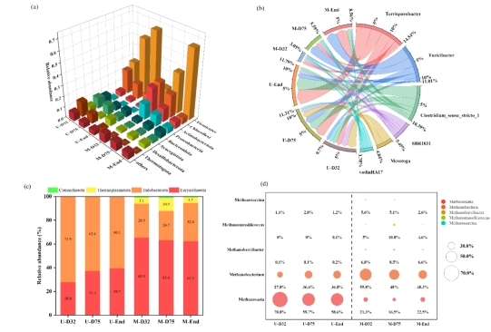 研究发现随着猪粪废水进水的浓度提升(COD 2–7 g/L, TP 22–93 mg/L),UASB-AnMBR最终实现了96%的化学需氧量去除和63%的总磷去除,出色的污染物去除能力源自于生物降解和膜的截留。反应器具有不同的有机负荷率(OLR)和水力停留时间(HRT),形成了不同的生物群落。产甲烷过程中,高OLR的UASB以乙酸型产甲烷菌为主,低OLR的AnMBR以氢营养型产甲烷菌为主。AnMBR中多样化的微生物群落结构有助于提高UASB出水中未完全降解污染物的去除能力。实验表明,UASB-AnMBR可以作为一种有效的实际猪粪废水处理工艺。