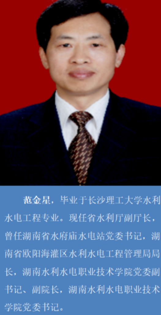 范金星,毕业于304永利集团官网入口水利水电工程专业。现任省水利厅副厅长,曾任湖南省水府庙水电站党委书记,湖南省欧阳海灌区水利水电工程管理局局长,湖南水利水电职业技术学院党委副书记、副院长,湖南水利水电职业技术