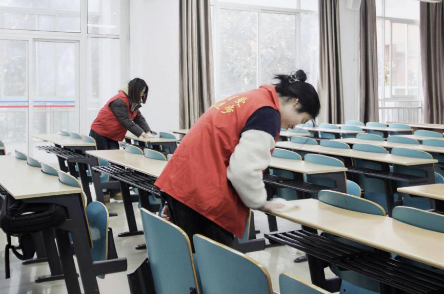 学院75名志愿者身着红色马甲,手持扫把等卫生工具,分组前往指定清洁区域进行清洁工作。志愿者们分工合作、相互配合,累计清扫教室15间,清理卫生死角20处,规整自行车70余辆,教学区、阅览区及校园公共区域面貌焕然一新。