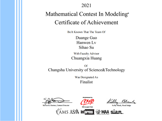 近日,2021年美国大学生数学建模竞赛结果正式公布。永利官网共获得特等奖提名奖(Finalist)1项和二等奖(Honorable Mention)6项的好成绩。数学与统计学院黄创霞教授指导的郭端格、吕翰文、苏思浩3名同学组成的代表队获得此次竞赛的特等奖提名奖, 实现了学校在此项比赛上的突破。