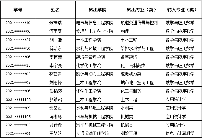 根据《304永利集团官网入口本科生转专业管理办法》(长理工大教〔2018〕16号)、《关于做好2021级在校本科生转专业(类)工作的通知》(长理工大教〔2022〕16号)、《数学与统计学院本科生转专业工作细则》,经学生自愿申请,学院资格初审和综合考核,拟同意接收以下14名转专业学生,名单如下(排名不分先后):
