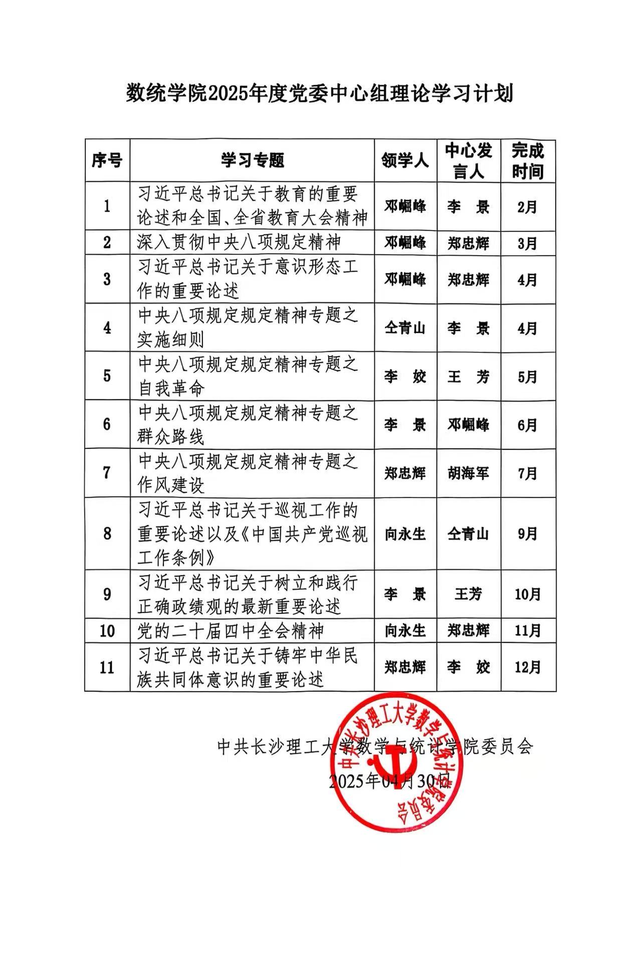 数统学院2025年度党委中心组理论学习计划