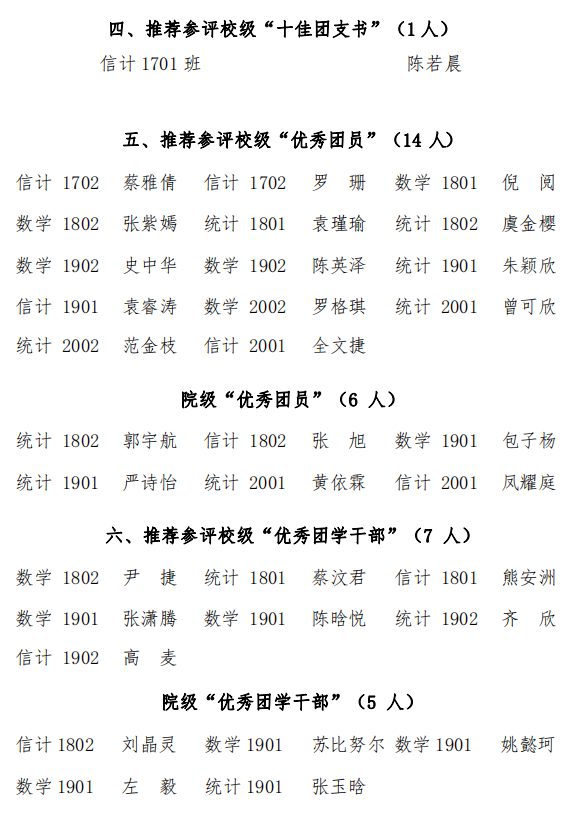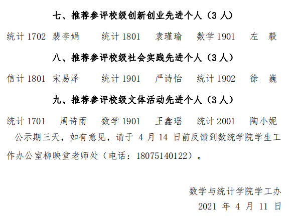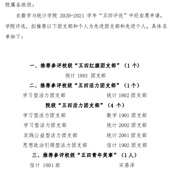 数统学院2020-2021“五四评优”公示名单